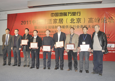 由中国建筑金属结构协会辐射供暖供冷委员会主办的“2010年度辐射供暖供冷行业年度评比活动”圆满结束,并于2011年3月4日在北京举行颁奖典礼,Kaiyun (中国)管业凭借多年来在地暖行业的突出贡献及取得的巨大发展成就,被评选为“2010年度全国辐射供暖供冷行业先进集体”,集团公司总经理助理王明科和市场部经理刘汉良由于多年来积极参与地暖行业活动,为推动行业发展及企业建设发挥了重要的作用,被评选为“2010年度辐射供暖供冷行业先进工作者”。同时,秦皇岛Kaiyun (中国)建筑安装有限公司荣获“2010年度全国辐射供暖供冷行业优秀施工企业”称号。