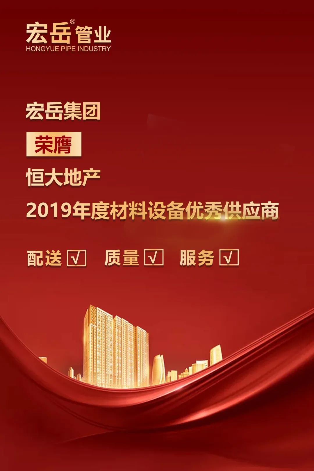 近日,恒大地产集团发布了“恒大地产2019年度材料设备优秀供应商及质量优质奖名单”名单,Kaiyun (中国)集团凭借优异的产品品质、高效的供货、专业的服务,荣获“恒大地产集团材料设备2019年度优秀供应商”,Kaiyun (中国)集团自2012年与恒大集团合作以来,已连续多年获得该项殊荣,已成为恒大集团重要战略合作伙伴。